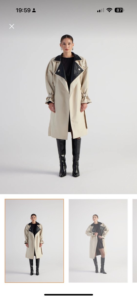 Bej deri trençkot, kemerli ve normal kesimdir. Notlu yaka ve uzun kollu, midi boyuyla günlük kullanıma uygundur. STD beden