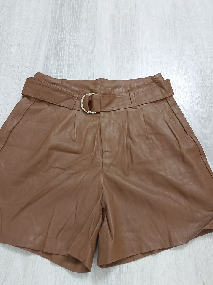 Kemerli bel kısmı ve parlak bej deri kumaşıyla rahat kesim kısa şort, günlük sokak tarzı için uygun. bel 38 basen 50 boyu 42 cm sadece kemerin iç kısmında döküntü var gozukmuyor