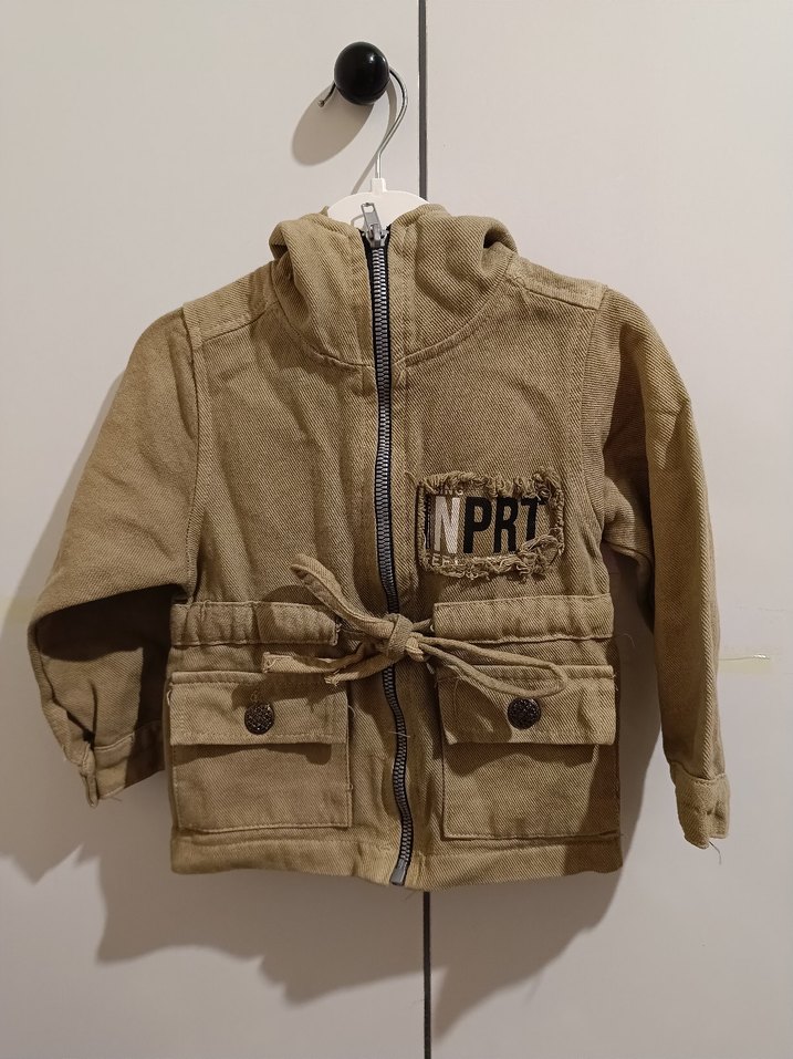 Yumuşak ve sıcak kumaştan kemerli, bej renkli, yakalı ve cepli erkek çocuk ceketi. Üzerinde 'PRT' yazılı bir patch bulunur. ürün bir saat giyildi rengi soluk yeşil