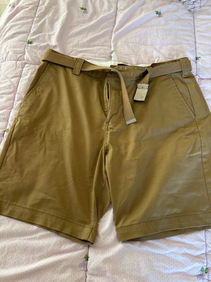 Yumuşak pamuk kumaştan yapılmış, kemerli ve bol kesim bej mini erkek şort. Günlük rahat sokak stili için uygundur.