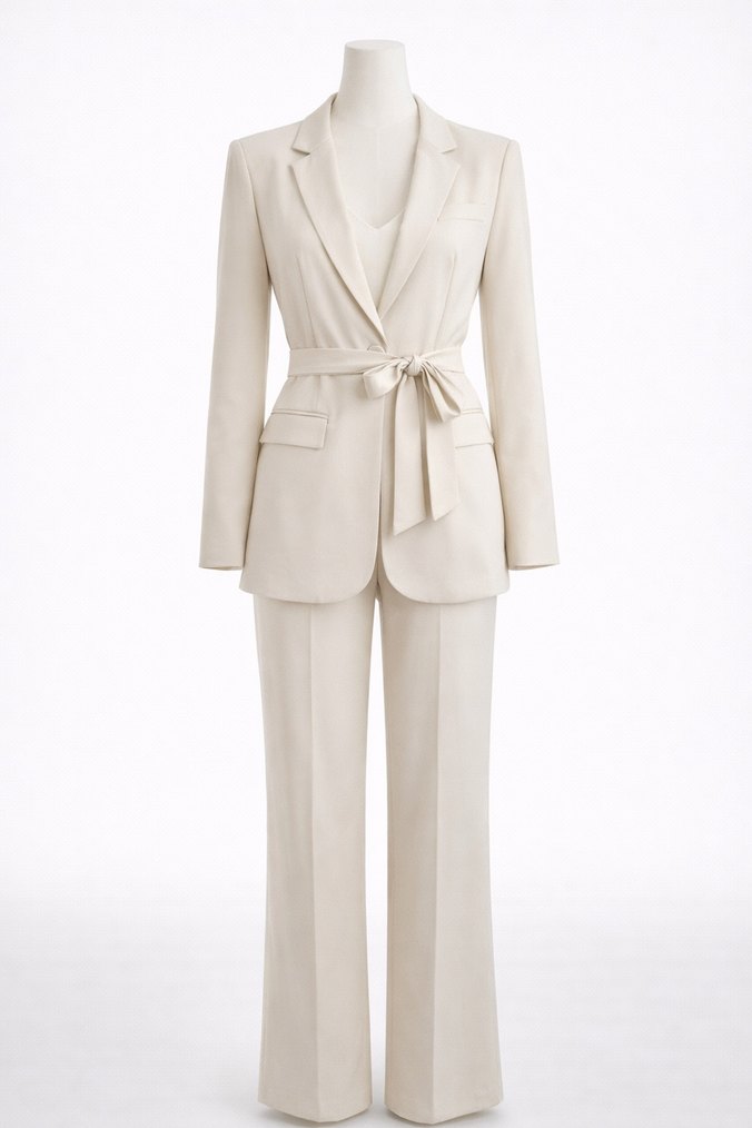 Bej renkli, kemerli ve uzun kesim kadın blazer ceket. Notlu yaka ve ipeksi dokusu ile klasik ve çağdaş iş stiline uygundur.