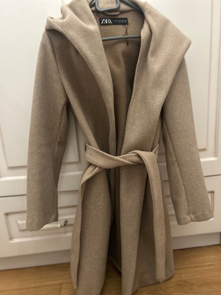 Kemerli ve kapüşonlu, yumuşak dokulu bej kadın kaban. Rahat ve şık kullanım sağlar.