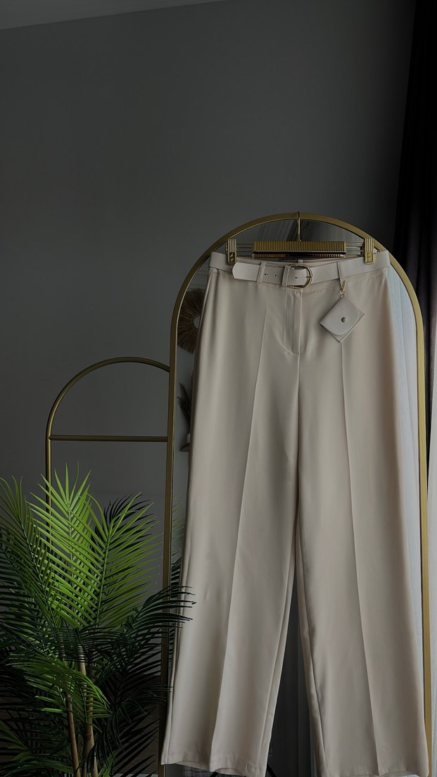 Kemerli beli ve midi boy uzunluğuyla bej renkte, düz kumaştan üretilmiş kadın kumaş pantolon. Ofis stiline uygun, klasik zarafet sunar.