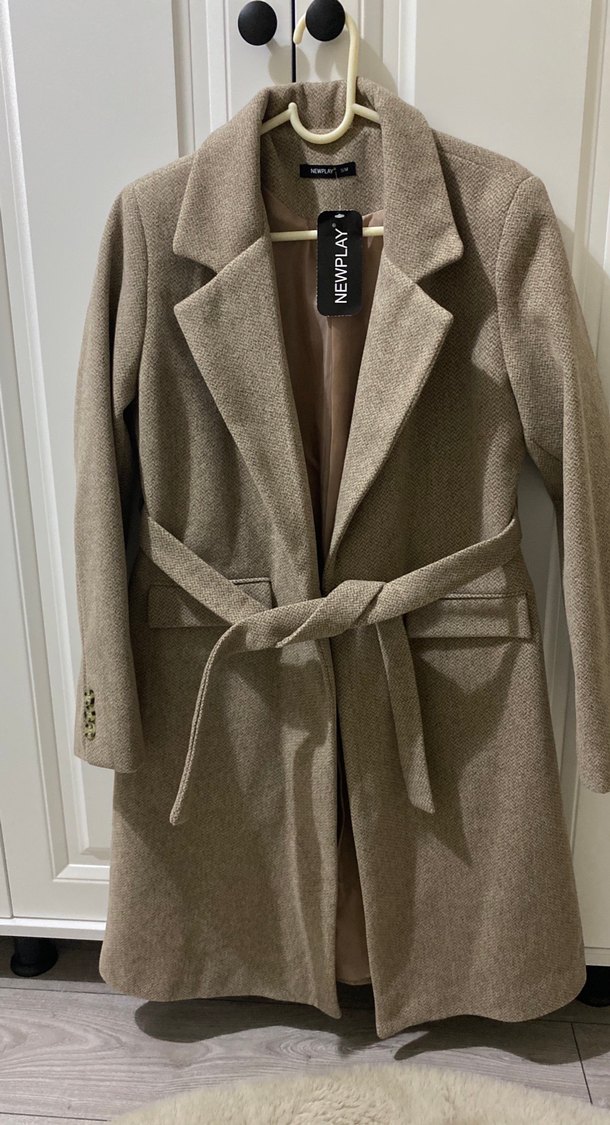 Bej renkli yün kaban, kesik yakalı ve kemerli bel detayına sahiptir. Normal uzunlukta, uzun kollu ve desen içermeyen modeliyle rahat bir kullanım sunar. Bedeni S-M ama bence kalıp olarak XS-S için daha uygun.İki kol arası 47 boyu 98 cm. Oversize değil kalıp normal
