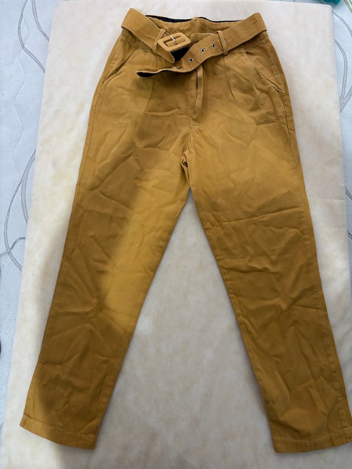 Kemerli bel ve havuç kesimle günlük kullanıma uygun parlak görünümlü bej süet kadın pantolonu. ✨