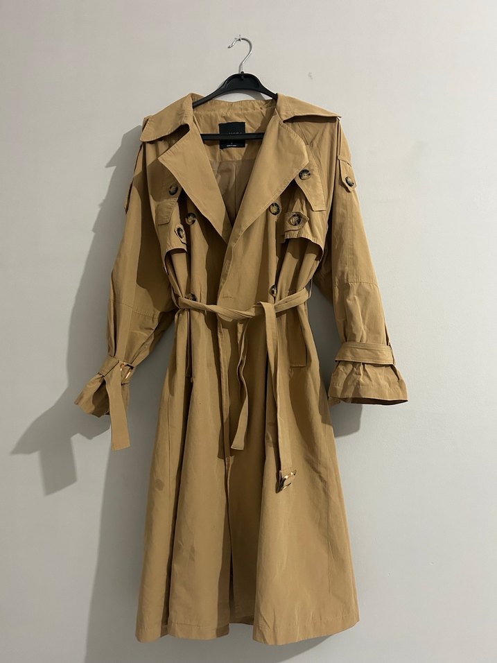 uzun kesim, salaş fitte bej trençkot. Kollar ve bel kemerli ayarlanabilir. Markası manuka