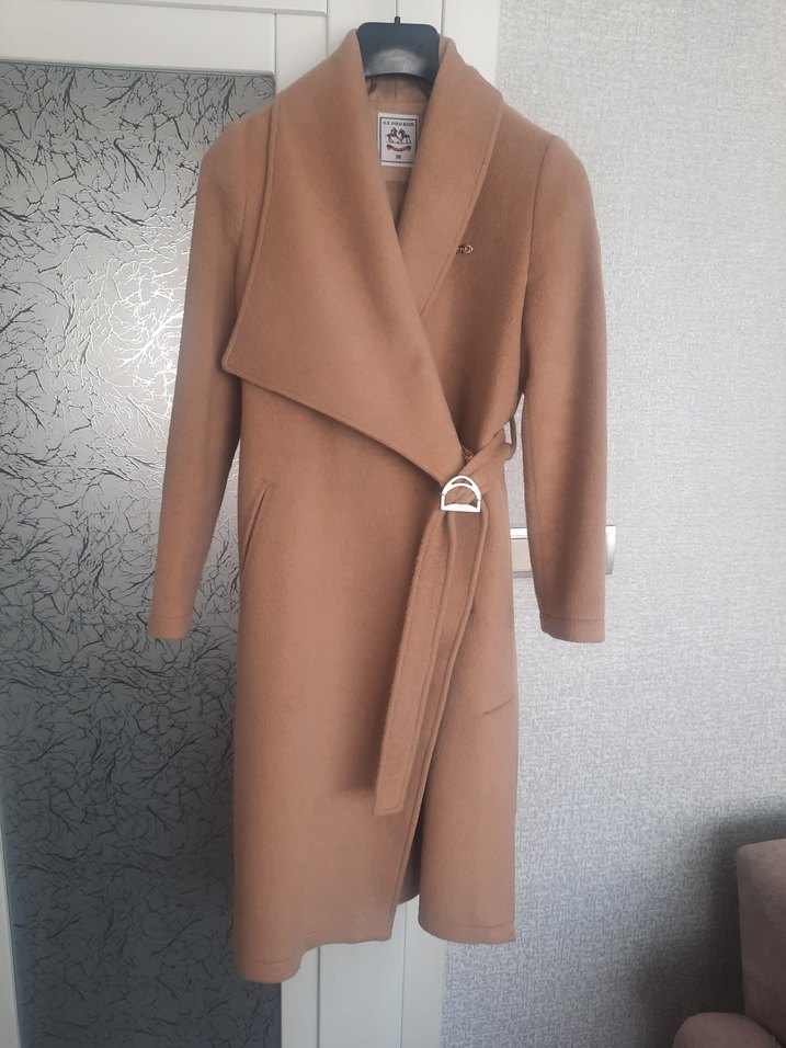 Bej renkli, kemerli, uzun kadın kabanı. Yumuşak ve sıcak kumaştan, klasik kesim ve askılı kollara sahip. yünlü polo marka 36 beden
