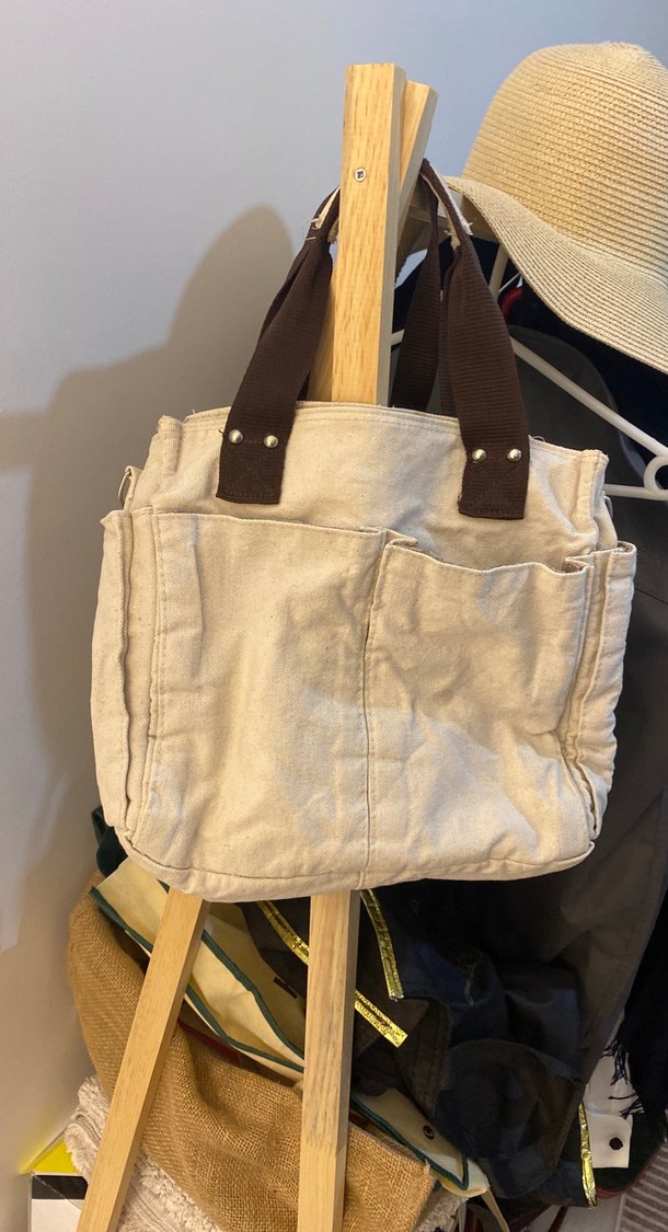 Bej keten kumaştan yapılmış, kemerli, koyu gri saplı kadın çantasıdır. Minimalist ve bohem tarzı, günlük kullanıma uygundur.