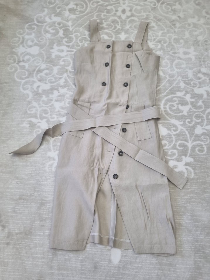 Kemerli Bej Keten Kadın elbise