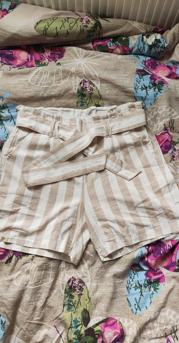 Kemerli, açık renk çizgili desene sahip bej keten mini şort. Bol kesim ve bohem tarzda, günlük kullanım için uygundur.