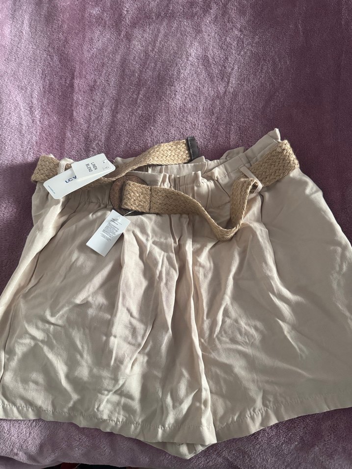 Kemerli, bol kesim, bej keten mini şort, rahat ve trend görünüme uygun, günlük kullanıma ideal.