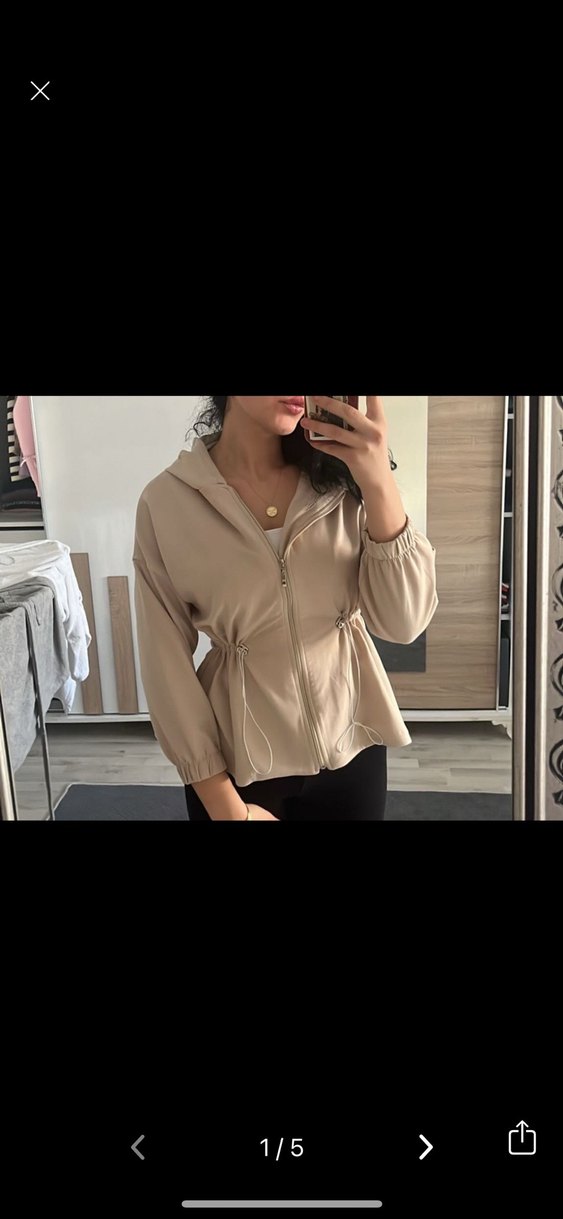 Bej renkte, kemerli ve fermuarlı, bol kesim kısa kadın ceket. Uzun kollu ve yuvarlak yakalı, yumuşak sentetik kumaştan üretilmiştir.