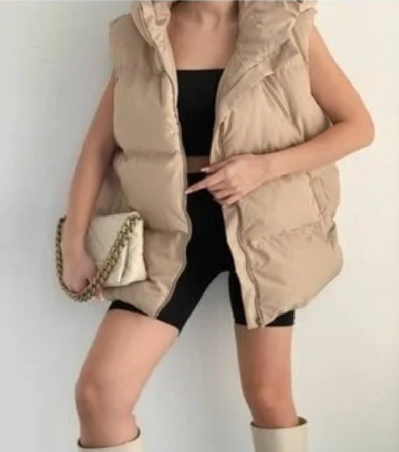 Kemerli, yüksek yakalı ve kolsuz bej yelek. Sentetik kumaştan üretilmiş, kısa ve mini boyda, rahat günlük kullanıma uygun.