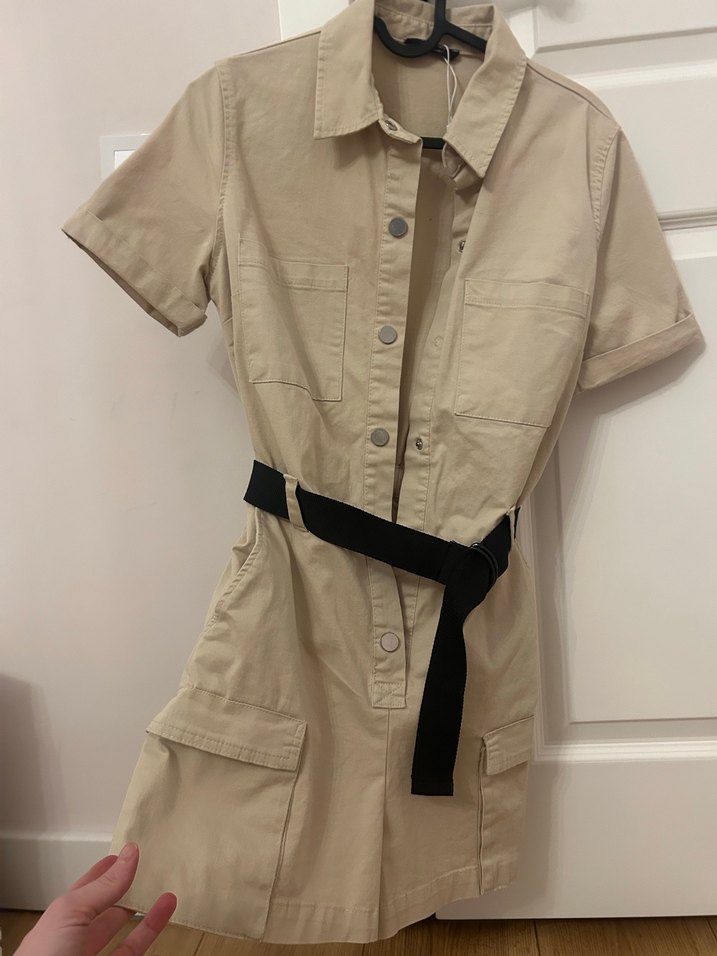 Kemerli, kısa kollu, bej renk, kısa tulum. Günlük kullanıma uygun, trend sokak stili için ideal.