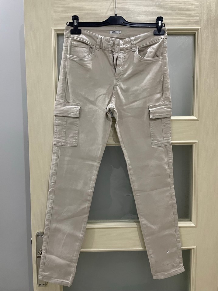 Bej renkli, midi boy, kemerli ve regular fit kesime sahip kadın kumaş pantolon. Sentetik kumaştan üretilmiş, desen içermeyen günlük sokak stili pantolon. Sol ön paçada defosu mevcut