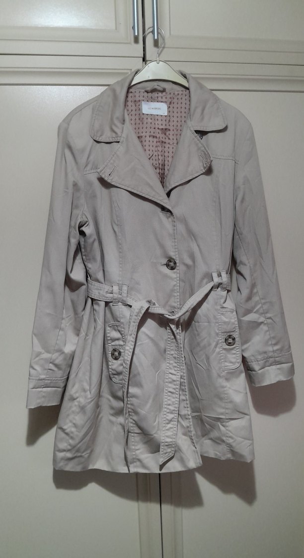 Bej renkli kadın trençkot, kemerli bel, kesik yaka ve normal kesime sahiptir. Yumuşak sentetik kumaştan üretilmiş, midi boyda ve askılı kolludur.