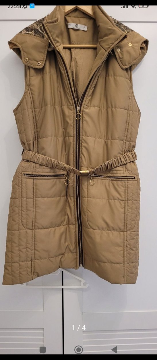Kemerli, parlak bej renkli, kolsuz midi yelek. Çıtçıtlı yakası ve fermuarlı cepleriyle rahat ve şık bir görünüm sunar. çok az giyildi yepyeni duruyor