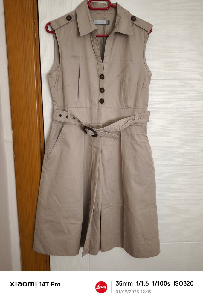 Keten kumaştan, kemerli, bej renkte, kolsuz midi elbise. Notlu yaka ve düğme detaylarıyla minimalist ofis şıklığı sağlar.