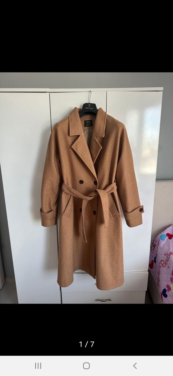 Koyu bej renkte, yün kumaştan kemerli ve normal kesim midi uzunlukta kadın kaban. Notch yakalı ve bant detaylı kollarıyla günlük kullanıma uygun şık bir parça.