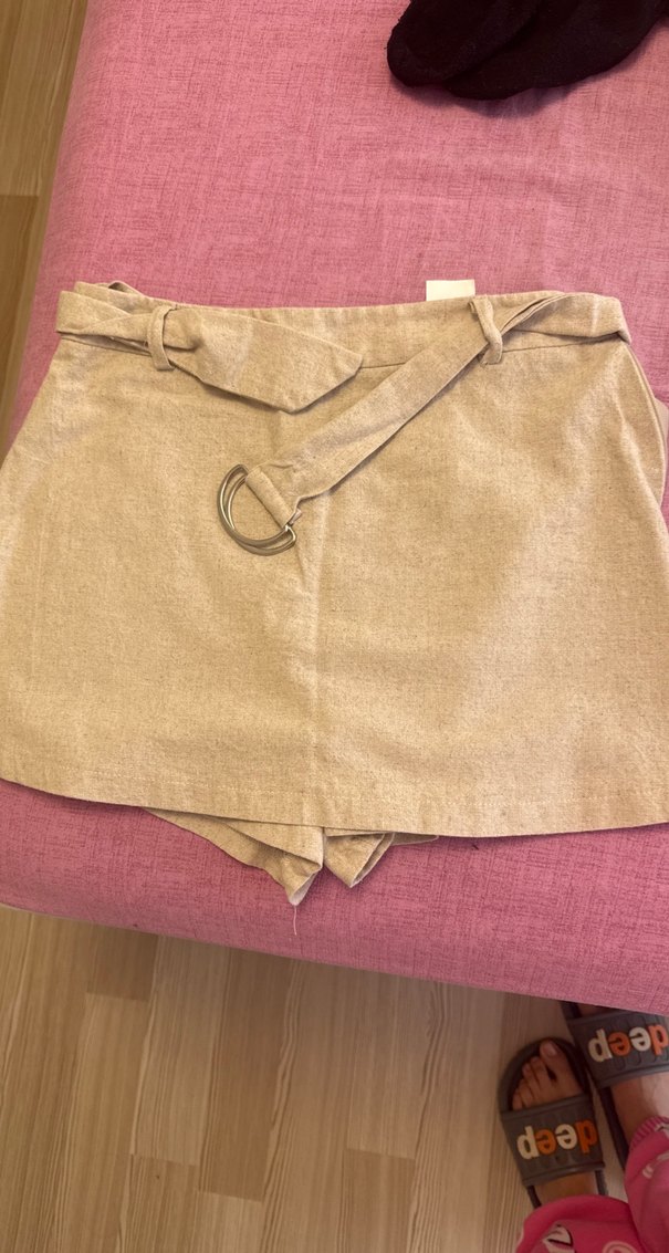 kemerli bej mini şort etek . Günlük sokak stiline uygun rahat bir tasarım.