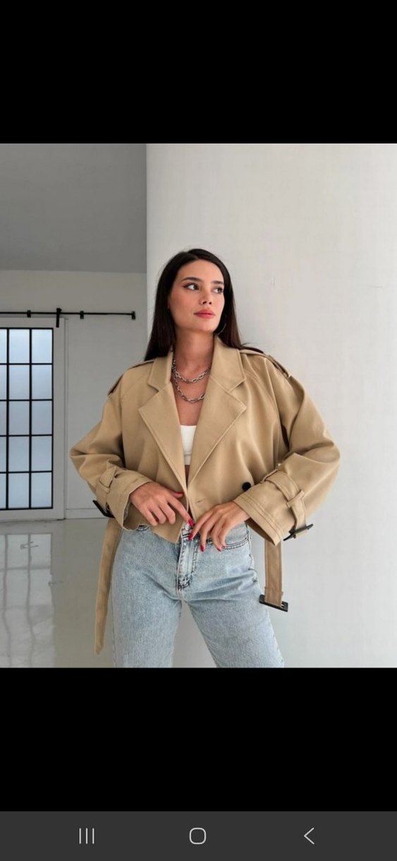 Bej renkte, kısa boylu süet trençkot, bol kesim ve uzun kolludur. Kemerli ve çentikli yaka detayına sahiptir, günlük sokak stiline uygundur.