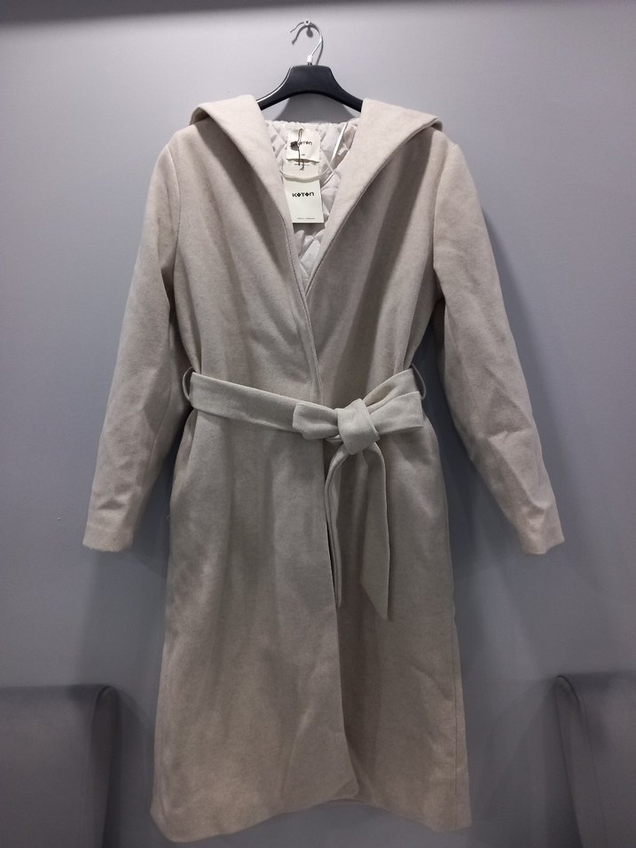 Bu kadın kabanı, kemerli bel, uzun kollu ve kesik yaka detayıyla dikkat çeker. Bej renkte, sentetik kumaştan yapılmış, rahat kesim ve uzun boyludur.