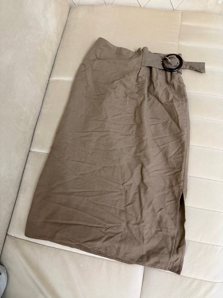 Yumuşak keten kumaştan yapılmış, kemerli, bej-gri tonlarında, vücuda oturan uzun etek. Minimalist sokak stili için uygundur, günlük kullanıma idealdir.