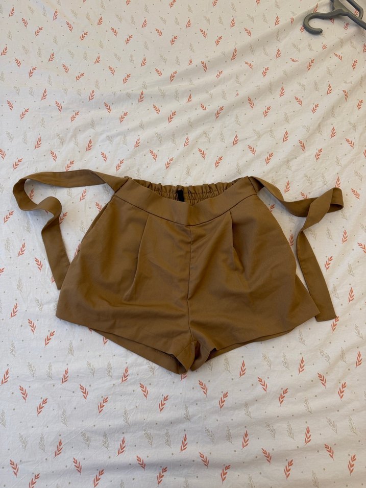 Kemer detaylı, yüksek bel, bol kesim bej mini şort. Pürüzsüz sentetik kumaştan, günlük sokak stiline uygun.