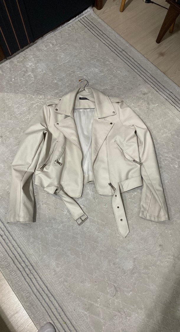 Kemerli, beyaz deri ceket, uzun kollu ve kesimli. Midi boyda, desen içermeyen günlük kullanıma uygun şık parça.