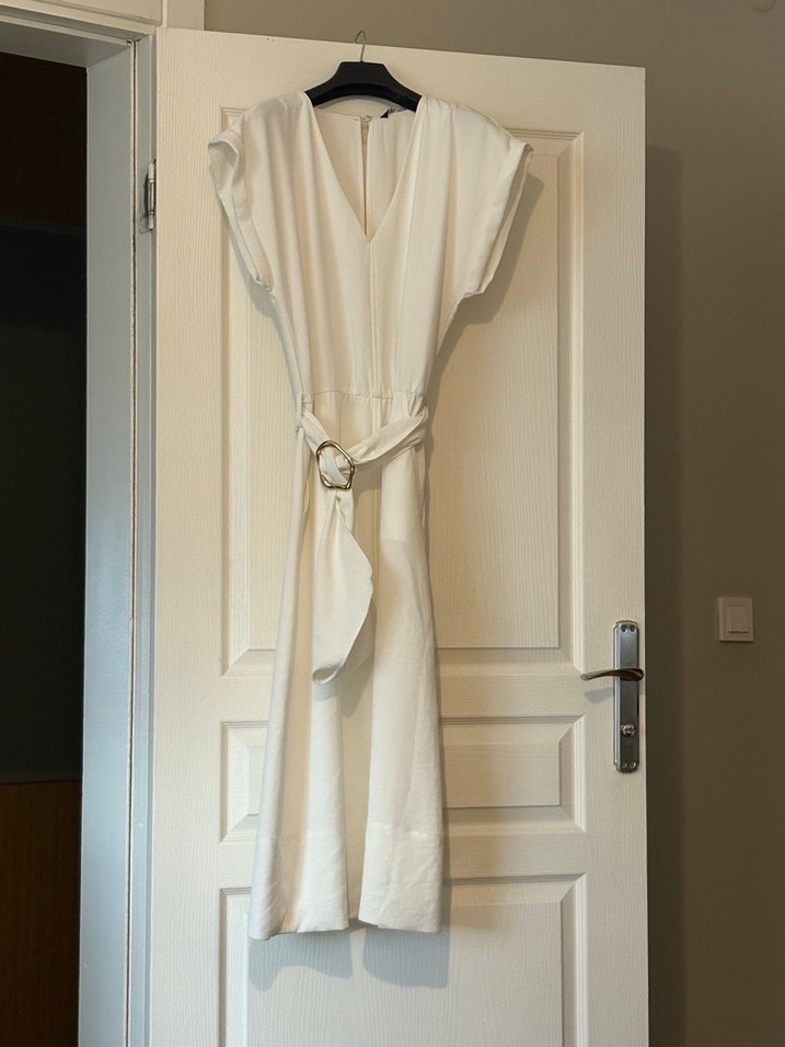 Kolsuz, beyaz keten uzun elbise, V yakalı ve kemerli, klasik şıklık sunar. Minimalist tasarımıyla düğünler için uygundur.