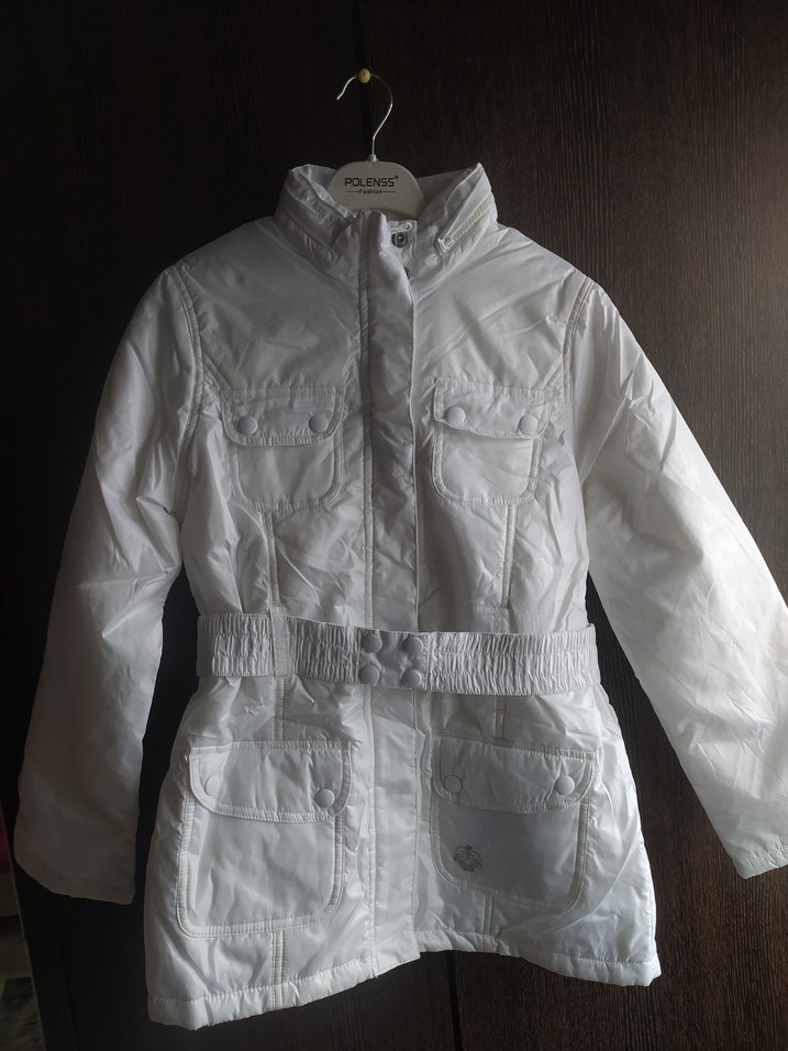 Parlak beyaz renkte, kemerli ve kesimli kız montu. Çıtçıtlı cepler ve kesik yakasıyla sokak modasına uygun, rahat bir tasarım.