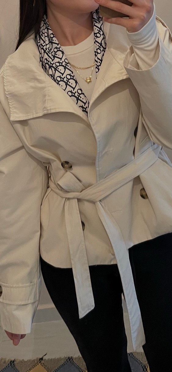 Pamuklu beyaz trençkot, kemerli ve notlu yakalıdır. Salaş kesimi, askılı kolları ve midi boyuyla Paris sokak modasına uygundur. Günlük kullanım için idealdir.