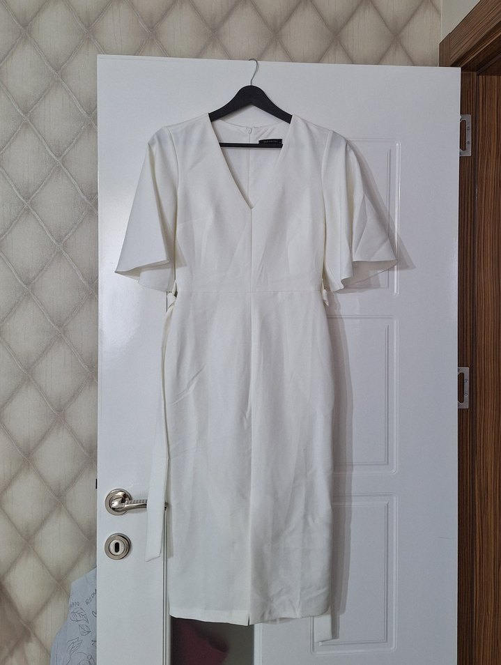 Beyaz midi elbise, kısa kollu, V yaka ve kemerli. , rahat kesimli, minimalist ve şık tasarım, ofis için uygun. sıfır üründür tek sefer dışında asla giyilmedi. sağlam paketleme ile gönderilir #elbise 34 beden bevaz elbise. midi boy. sadece 1 kez kullanıldı. nikâh elbisesi olarak kullanabilirsiniz. arkası fermuar kapamalı. sağlam paketleme ile gönderilir. #elbise #nikahelbisesi #beyazelbise