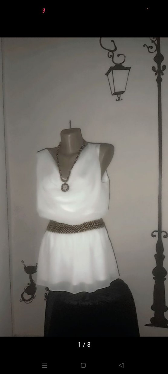 Kolsuz, beyaz mini elbise, bol kesim ve kayık yaka ile kemerli. İpek gibi kumaştan, minimalist bohem tarzında, günlük kullanım için uygundur. Bluz olarak da giyilirr
