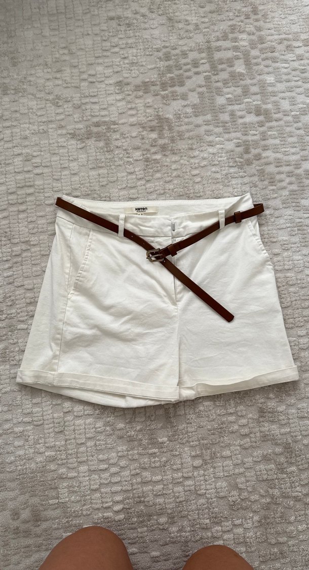 Yumuşak pamuk kumaştan yapılmış, kemerli beyaz mini şort. Rahat kesimi ve günlük sokak stiline uygun yapısıyla öne çıkar.