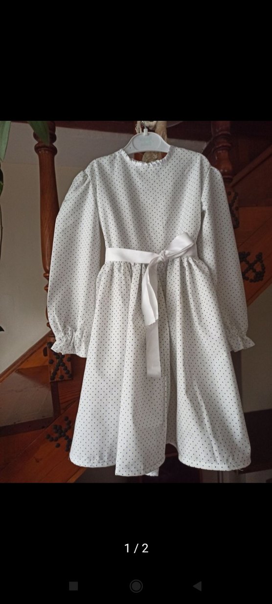 Uzun kollu, yuvarlak yakalı beyaz pamuk kız elbisesi. Bol kesim ve belde kemer detayı bulunur. Kumaş üzerinde ince gri puantiye deseni vardır. göğüs 60 kol boyu 38 boy62
