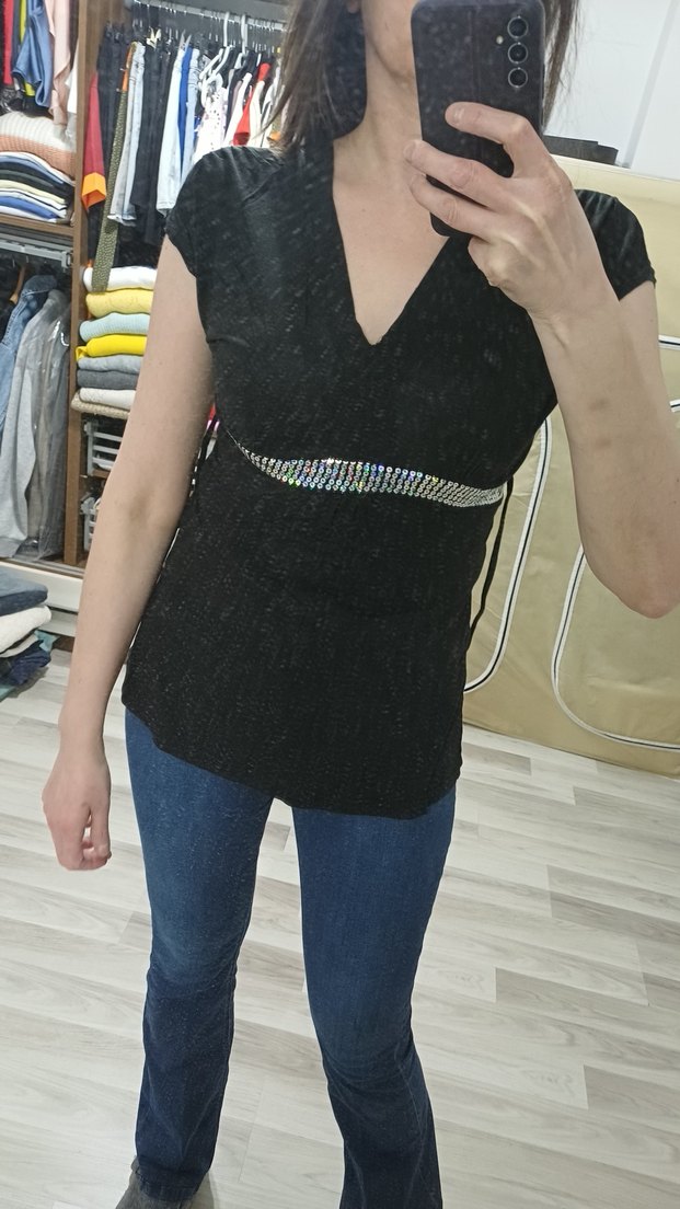 V yaka ve kemerli, koyu gri denim kumaştan yapılmış, fitted kesim hamile veya günlük bluz. Askılı kollu ve normal uzunluktadır, günlük rahat kullanıma uygundur.