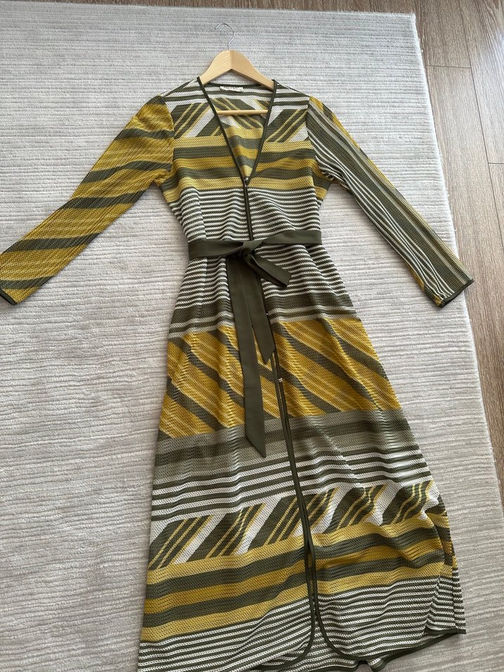 Kemerli, çizgili desenli bohem uzun elbise. V yaka ve askılı kollu, rahat kalıp. Yumuşak sentetik kumaştan, günlük kullanıma uygun. Ürün sayklı kullanıldı.deforme yoktur