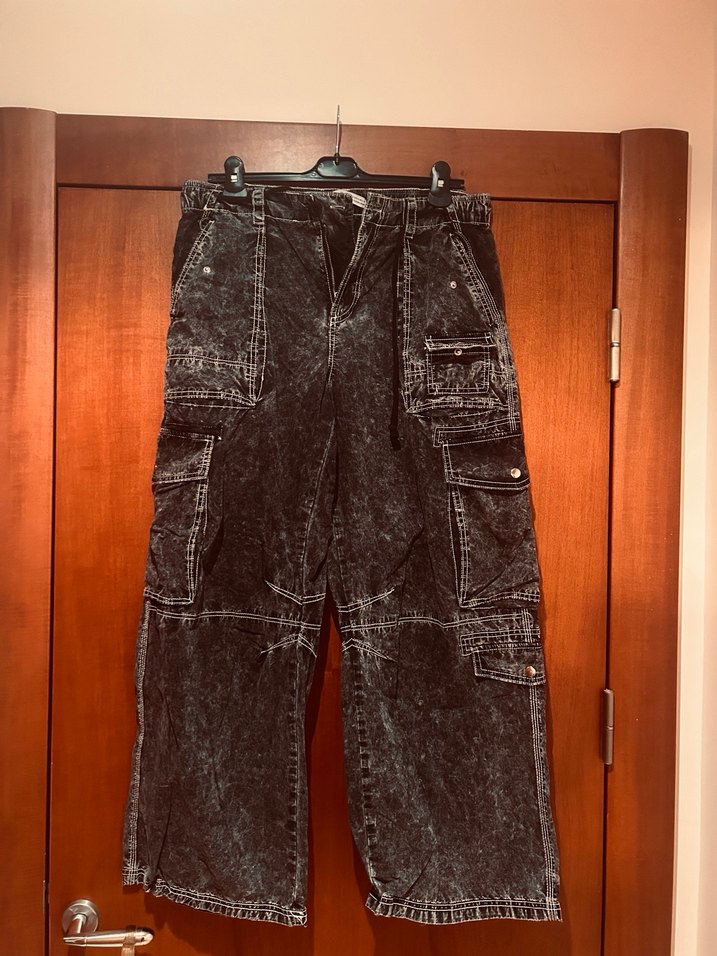 Kemerli, bol kesim, koyu kahverengi denim kot pantolon. Bağlı desenli ve çok cepli, midi boy, trend günlük stile uygun.