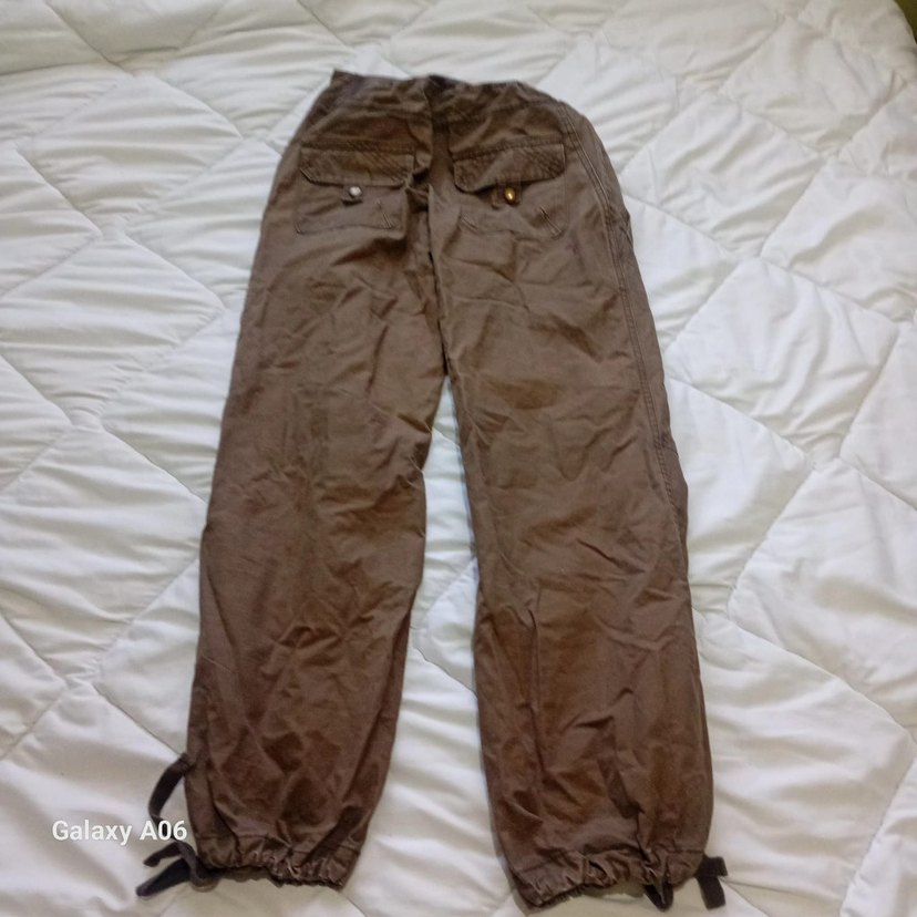 Kemerli, düğmeli arka cepli kahverengi keten pantolon, midi boy ve lastikli paçalarla bol kesim, günlük rahat sokak stili için uygun.
