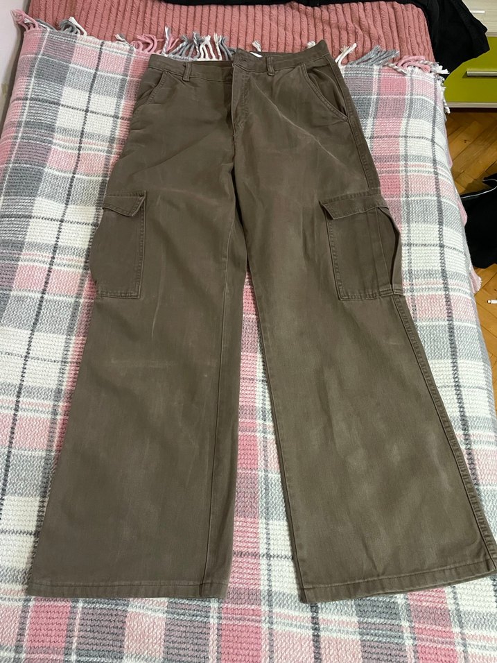 Kemerli bel ve yan cepleri bulunan, yumuşak dokulu tekstil malzemeden yapılmış bol kesim kahverengi kız pantolonu.