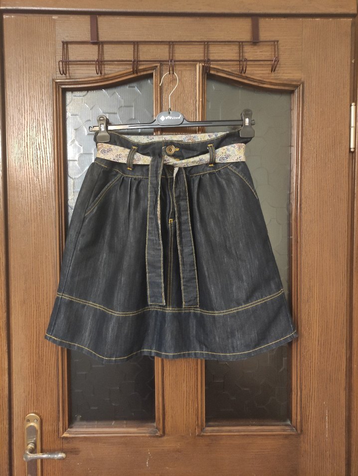 Kemerli bel ve bol kesimiyle lacivert kot midi etek, bohem tarzı yansıtır. Desensiz kumaşı rahat ve sade bir görünüm sunar. hiç kullanılmadı