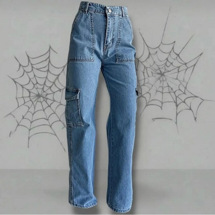Kemerli bel, bol kesim ve normal boyda mavi denim pantolon. Sokak stiline uygun, rahat ve günlük kullanıma uygun cepli tasarım.