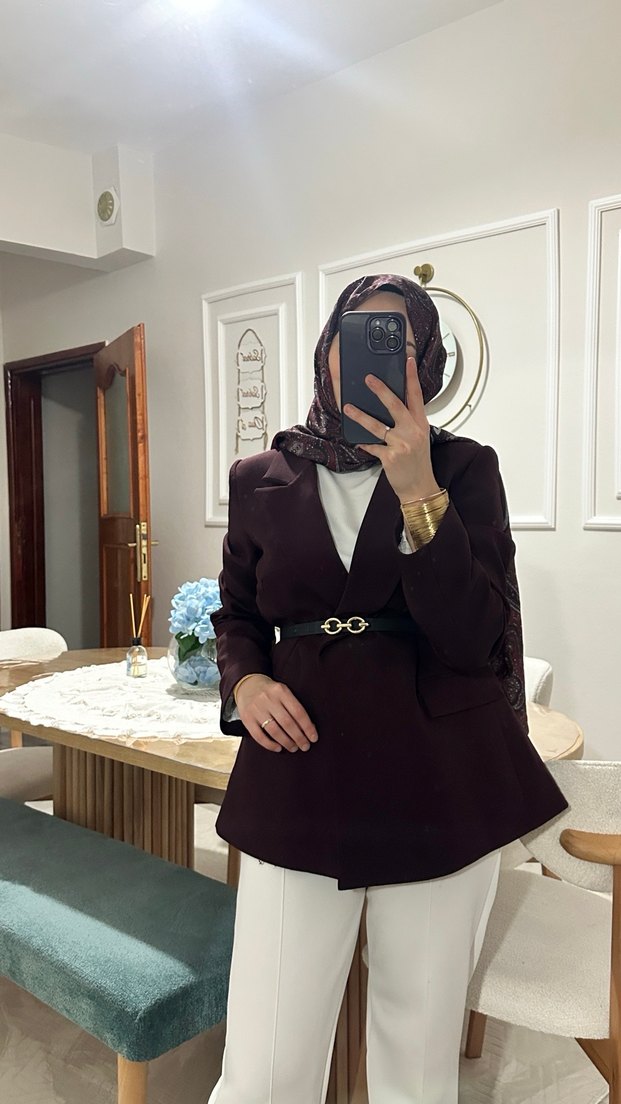 Bordo renkli, ipeksi kumaştan yapılmış kadın blazer ceket. Normal kesim, uzun kollu ve midi boyda, ofis veya sokak stili için uygundur.
