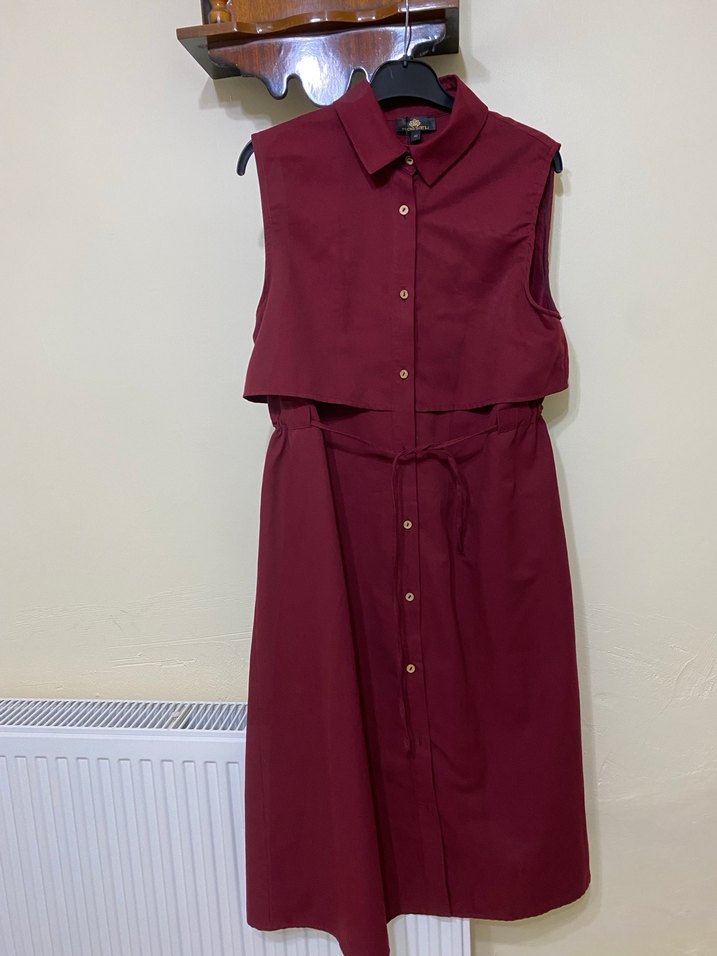 Kemerli, yakalı, kolsuz bordo midi elbise. Rahat kesim ve yumuşak sentetik kumaş. Günlük veya ofis kullanımı için uygun.