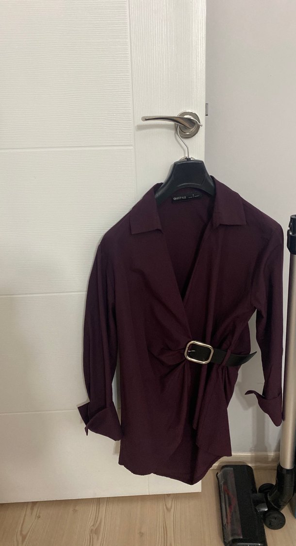 Kemerli, bordo renkli ve saten dokulu bu gömlek, yakalı ve askılı kolludur. Ofis kullanımı için uygundur.