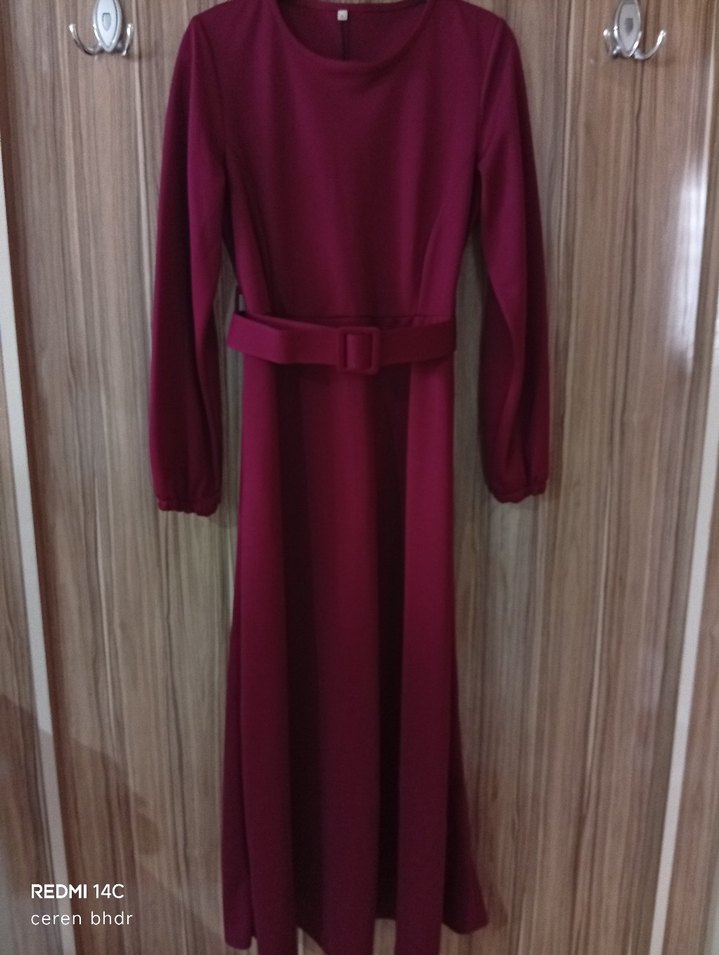 Bordo renkli, uzun kollu, yüksek yakalı ve kemerli bu uzun elbise, ofis için modern klasik bir görünüm sunar. Düz ve minimalist tasarımlıdır. bir kere tek giyildi