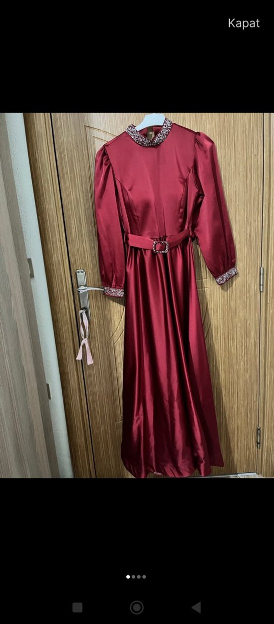 Bordo renkli, parlak saten kumaştan, yüksek yakalı ve uzun kollu kemerli klasik vintage tarzda uzun elbise. Düğün için uygundur.