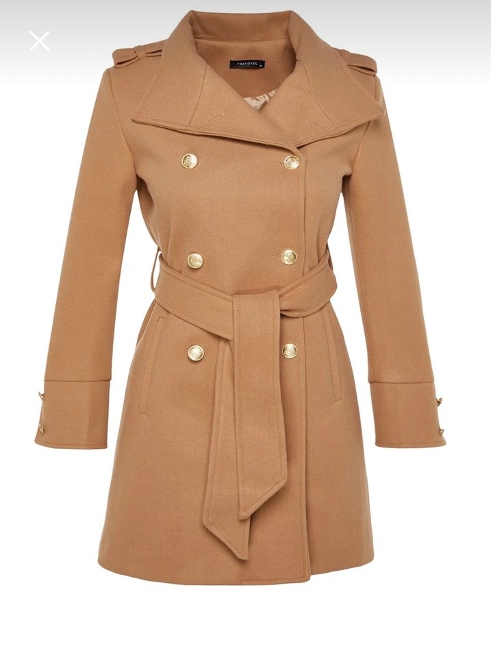 Kemerli bel, uzun kollu ve kırmalı yaka detaylı bej midi kaban. Altın düğmeli çift düğme tasarımına sahip, rahat kesim ve yumuşak kumaştan üretilmiştir. Yeni etiketlidir. İade süresi geçirildiği için satılıktır.