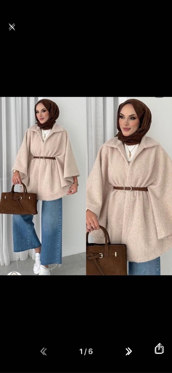 Camel renginde yün kaban, uzun kollu ve kemerli, bol kesim. Etnik desenli, midi boyda, günlük rahat sokak tarzına uygun.